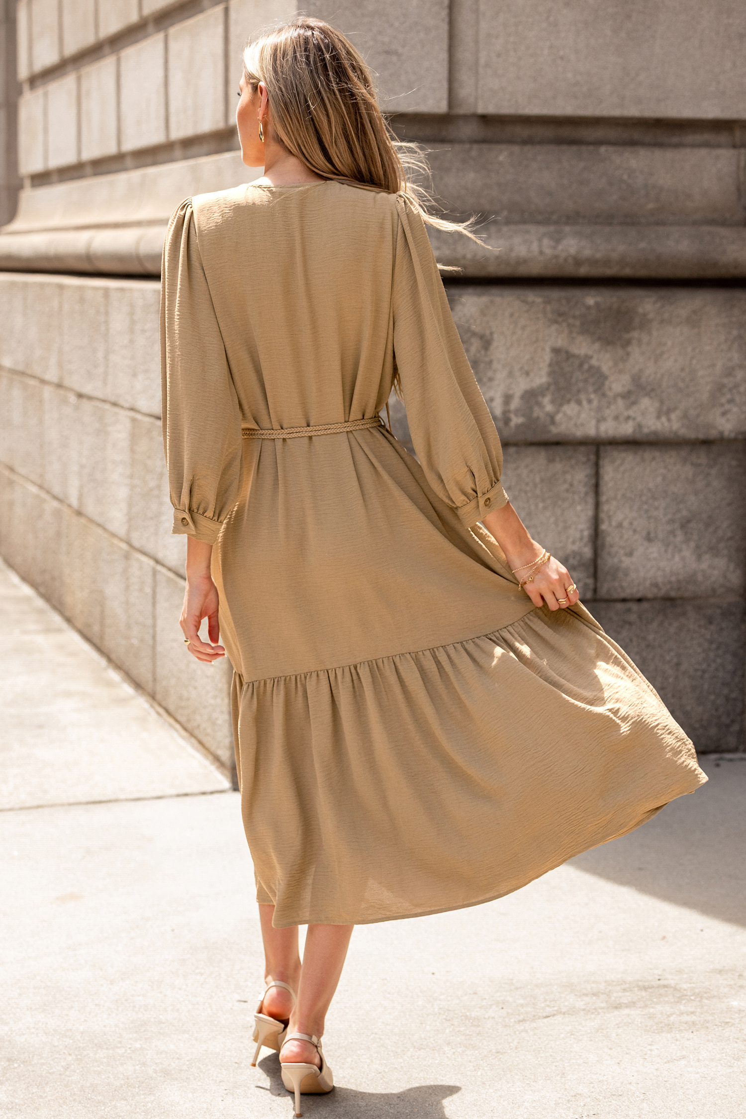 Das beigefarbene Midikleid ist ein zeitloses, fließendes Modell mit klassischem Charme! Mit seinem gekerbten Ausschnitt, den langen Ärmeln und der Midi-Länge ist es perfekt für entspannte Tage oder lässige Abendpläne.