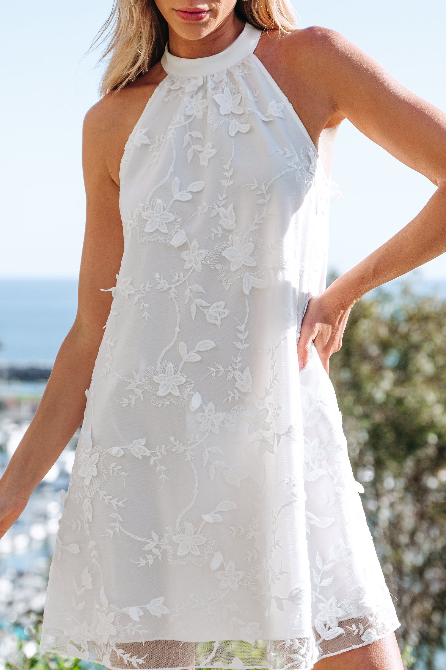 Weißes ärmelloses geblümtes Minikleid mit hohem Ausschnitt