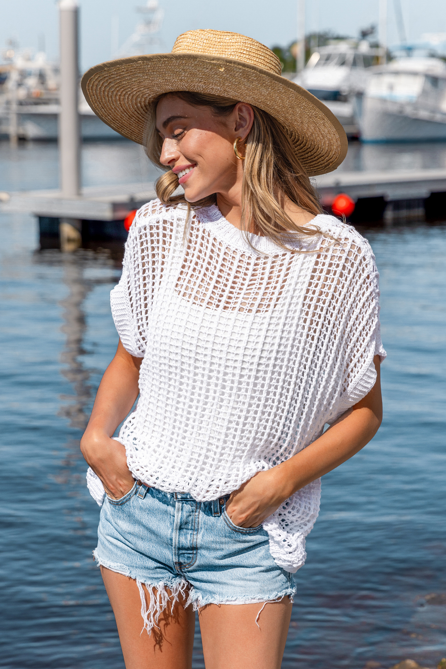 Weißes Rundhals-Kurzarm-Oberteil aus offenem Strick